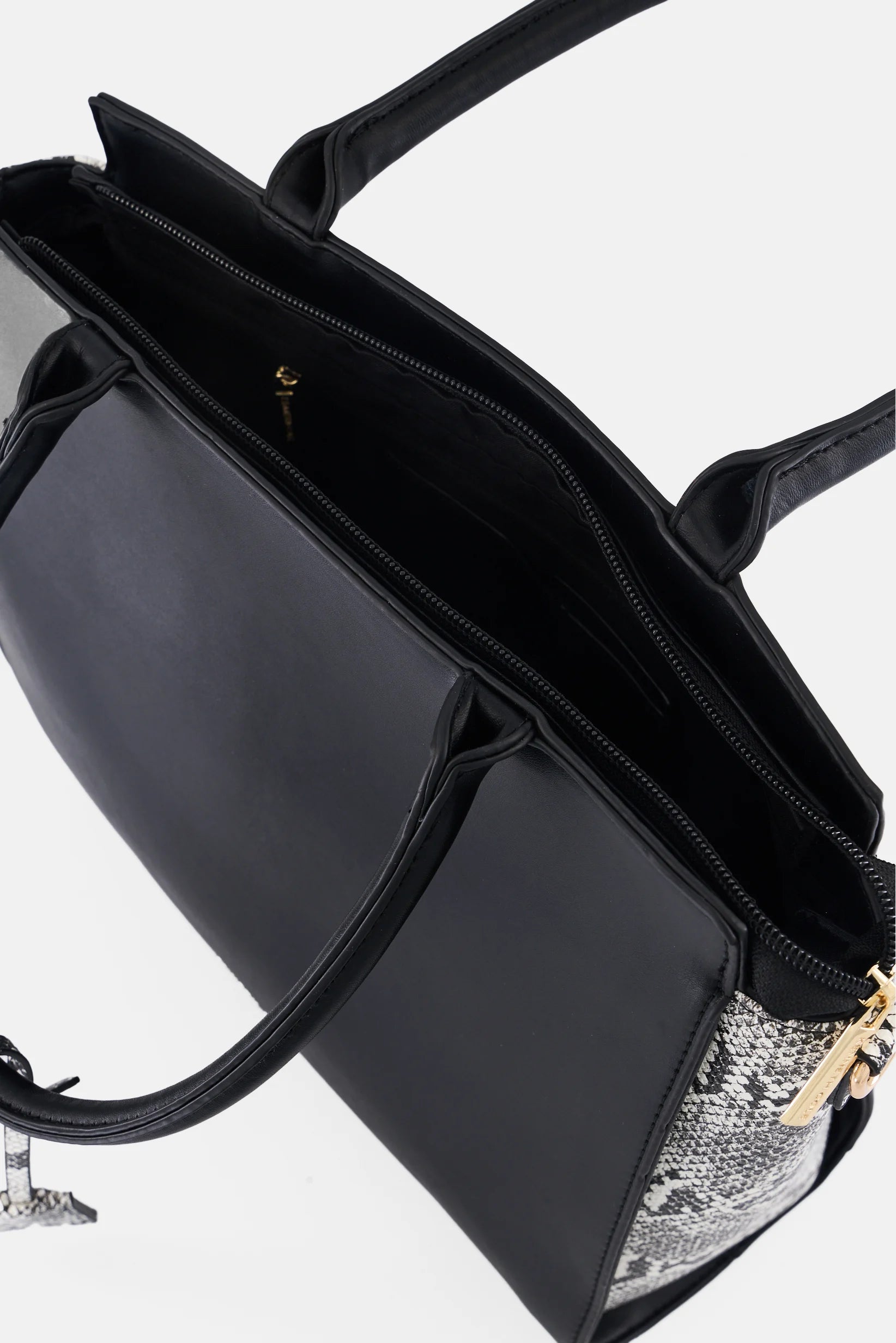 Bag Closure Zipper For Gift Yes Height 29 cm Ideal For Women Length 31 cm Width 11 cm Bag Accents Interior Slip Pockets, Interior Zippered Pockets Bag Lining Material Polyester Bag Material Leather Bag Strap/Handle Double Handle, Adjustable Strap Disclaimer Product color may slightly vary due to photographic lighting sources or your monitor settings., Dust bag included Pattern & Print Snakeskin Color Family Black